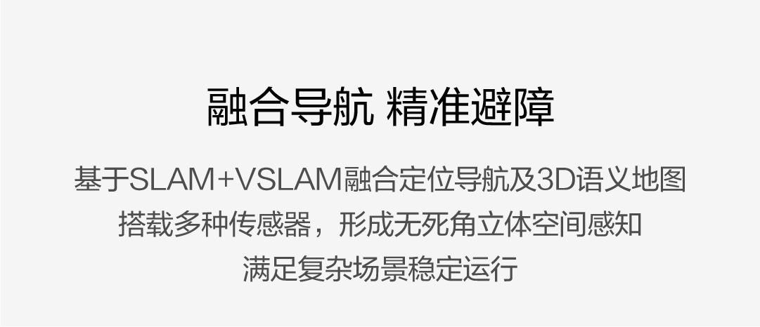 基于SLAM+VSLAM融合定位导航及3D语义地图,搭载多种传感器,形成无死角立体空间感知,满足复杂场景稳定运行